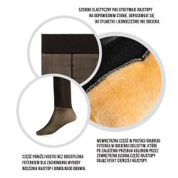 Wewnętrzna część w postaci grubego futerka w odcieniu cielistym, które po założeniu przebija kolorem przez zewnętrzną dzianą część rajstopy dając efekt cieńszej rajstopy. Rajstopy są jednocześnie grube i ciepłe, a z zewnątrz wyglądają jak cienkie i prześwitujące.